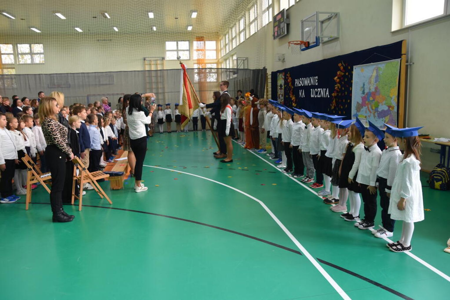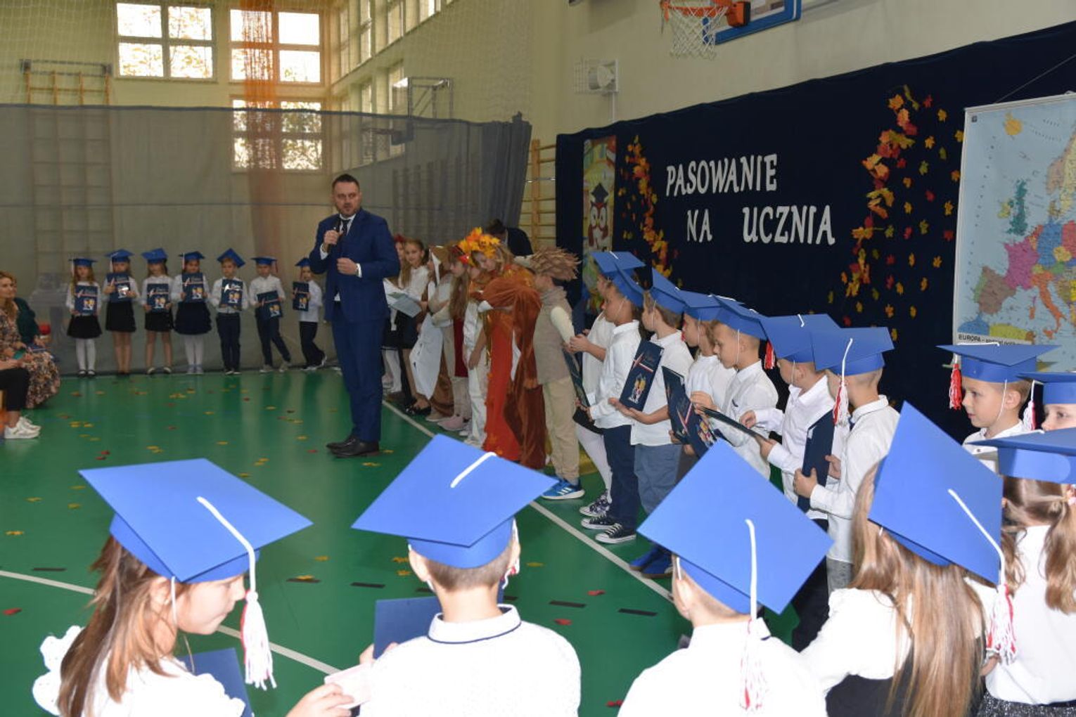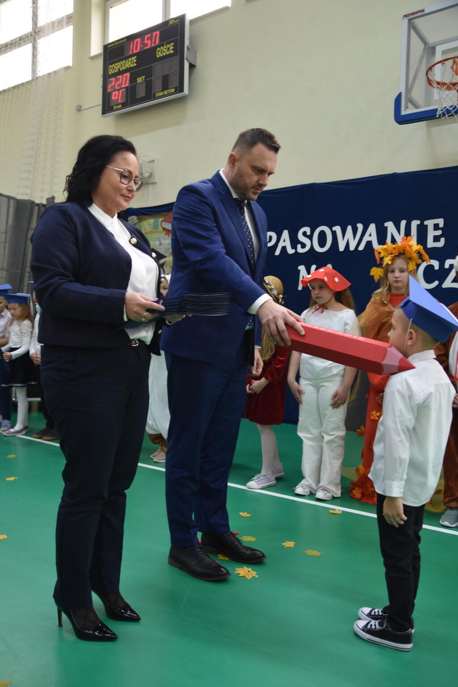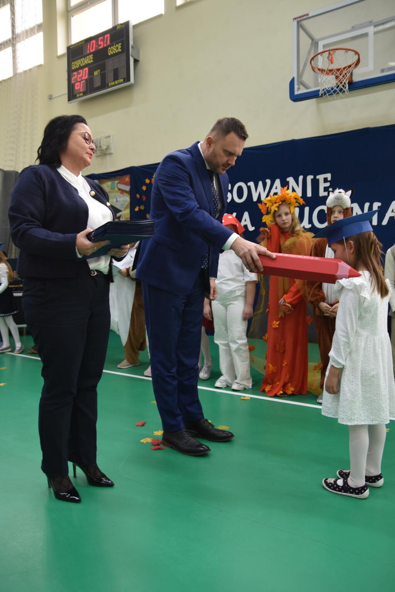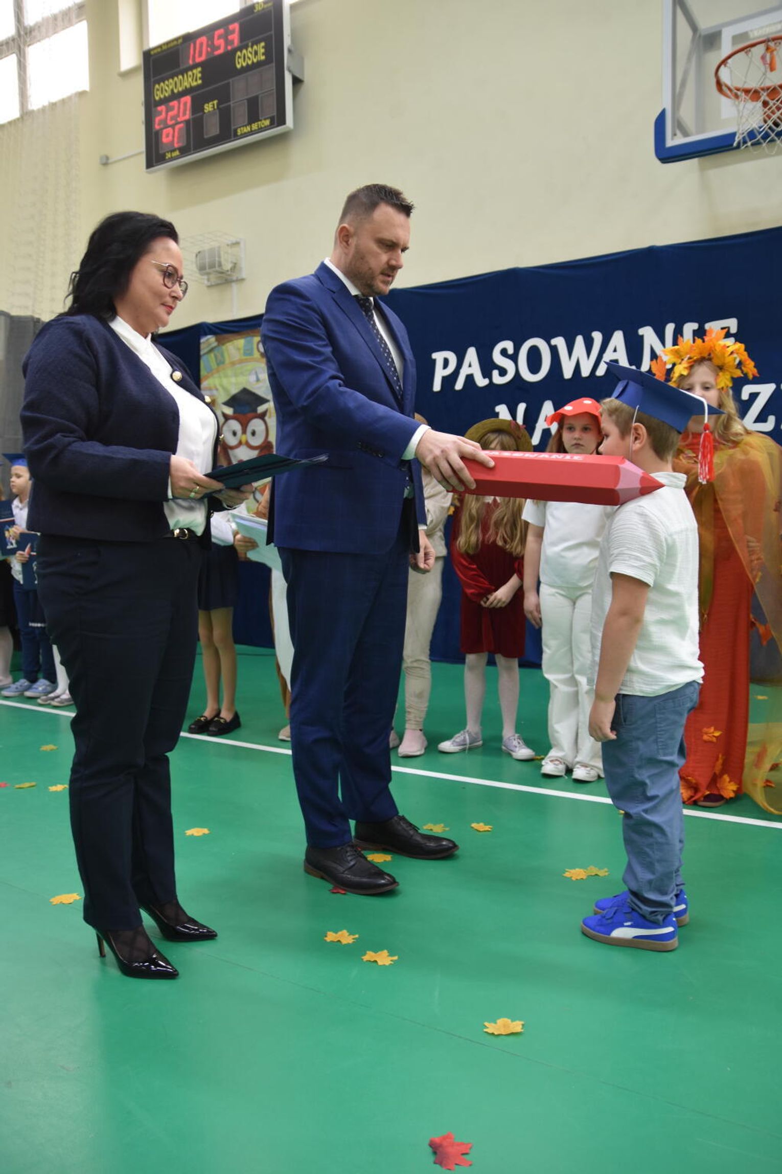 Kulminacyjnym momentem było uroczyste ślubowanie na sztandar szkoły. Pierwszoklasiści z powagą wypowiedzieli słowa przysięgi, obiecując być pilnymi uczniami i dobrymi kolegami. Następnie dyrektor szkoły - Marcin Maniek, przy asyście wicedyrektor - Katarzyny Szlachty, dokonał symbolicznego pasowania na ucznia. Był to niezwykle wzruszający moment, który na długo pozostanie w pamięci dzieci oraz ich bliskich.