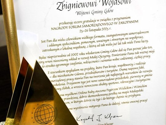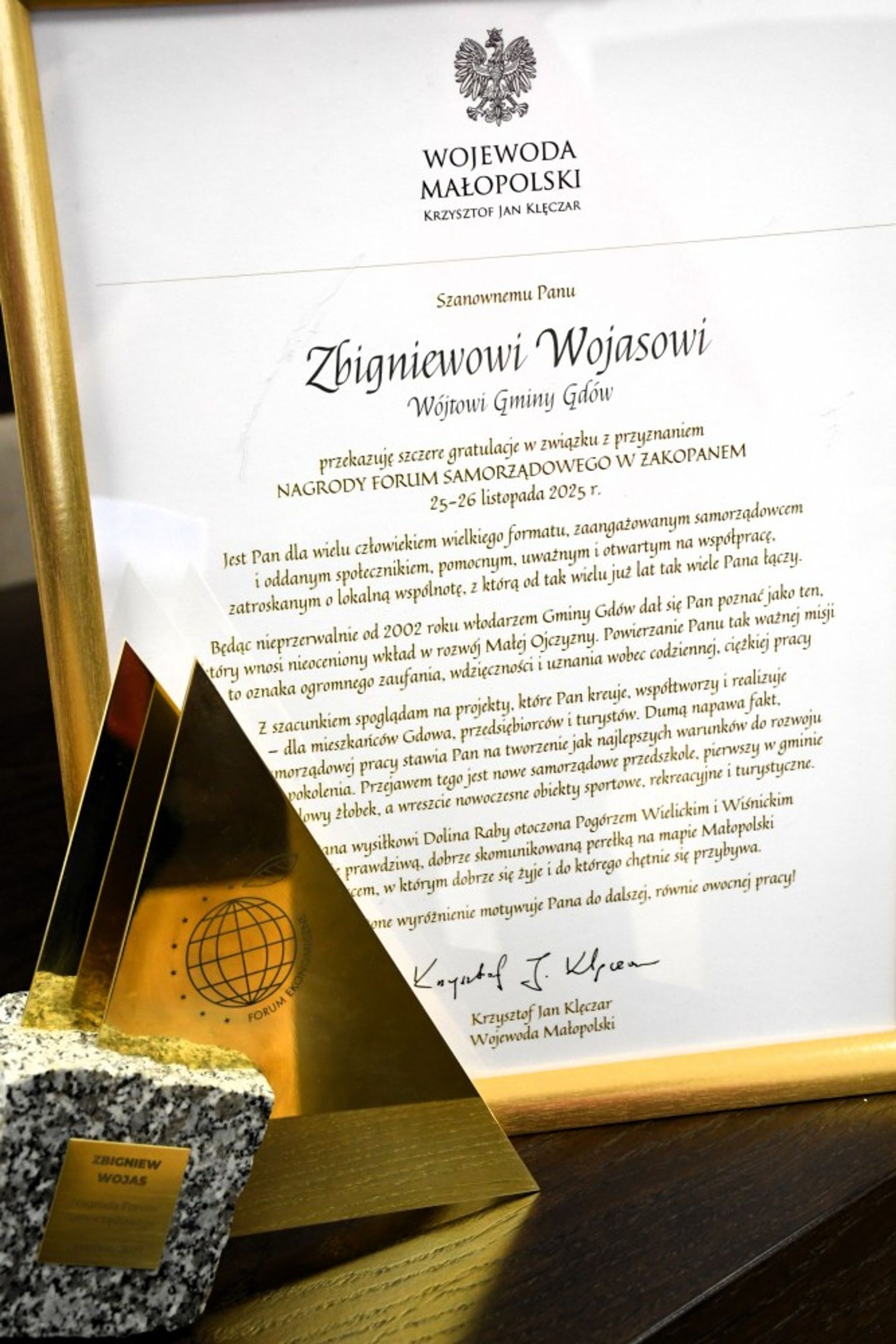 Za wieloletnie zaangażowanie na rzecz lokalnych wspólnot, skuteczne prowadzenie inwestycji oraz konsekwentną pracę na rzecz rozwoju społecznego i gospodarczego regionu uhonorowano czterech samorządowców z Małopolski. Wśród nagrodzonych znalazł się również Gospodarz Gminy Gdów -wójt gminy Gdów Zbigniew Wojas. Uzasadnienie do nagrody przedstawił zebranym Krzysztof Klęczar, wojewoda Małopolski, a Statuetkę wręczył minister energii Miłosz Motyka.