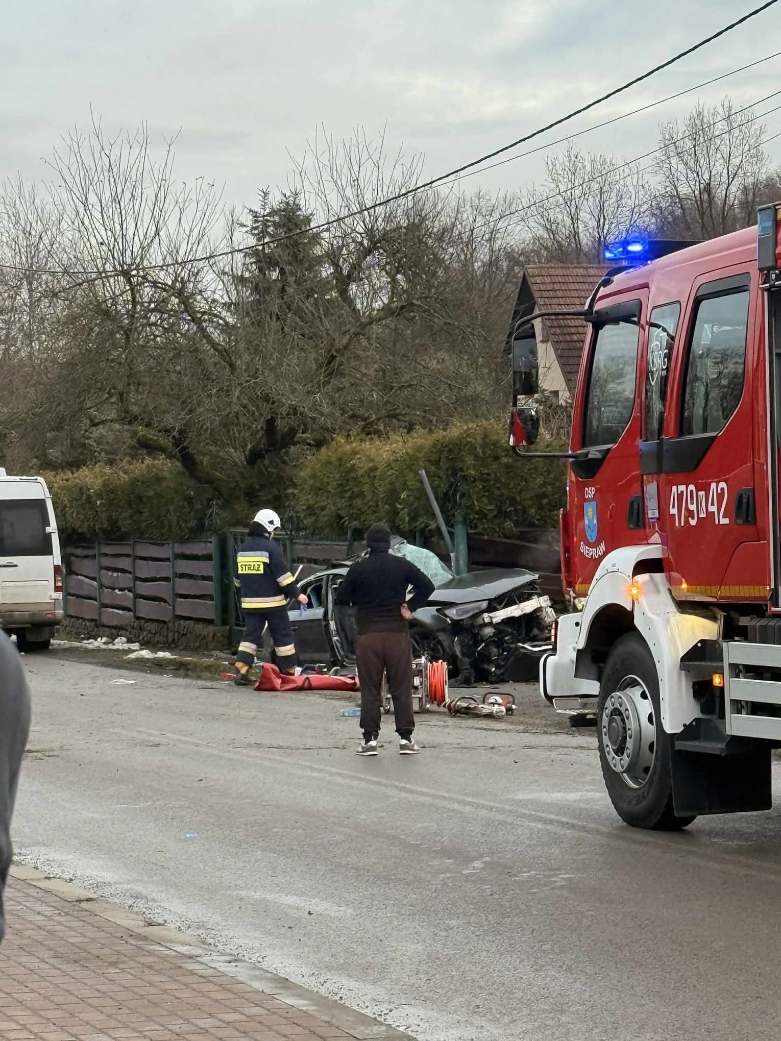 Do tragedii doszło około godziny 14:42. Jak wynika ze wstępnych ustaleń, samochód osobowy, którym podróżowali 21-letni mężczyzna i 17-letnia kobieta, z nieustalonych przyczyn wypadł z jezdni. Siła uderzenia była na tyle duża, że pojazd został poważnie zniszczony, a poszkodowani zostali uwięzieni wewnątrz.