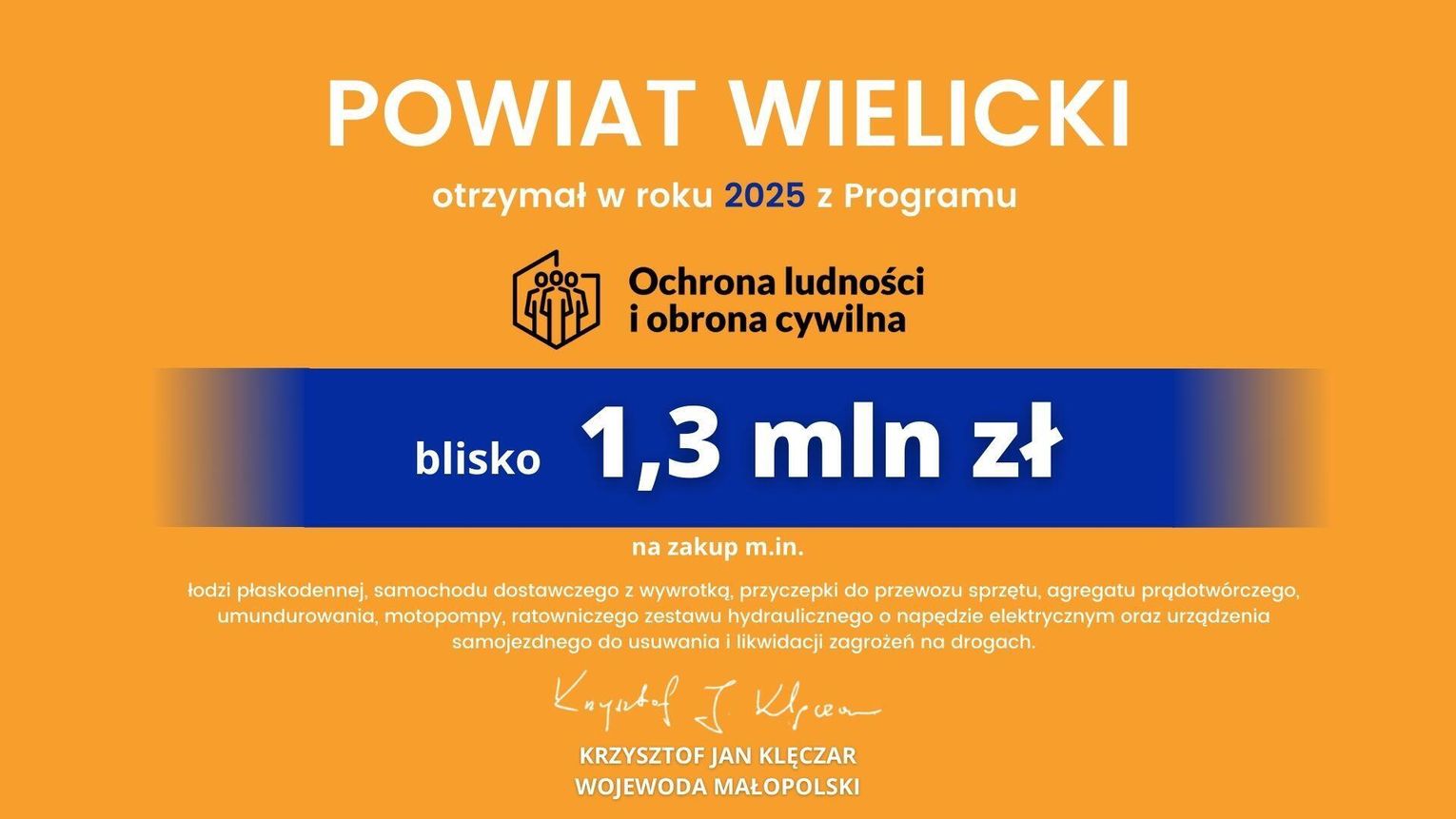 W ramach podpisanych umów na realizację Programu Ochrony Ludności i Obrony Cywilnej powiat wielicki oraz gmina Biskupice otrzymały dotację w wysokości ponad 2,1 mln zł (1,3 mln zł powiat wielicki i ponad 850 tys. zł gmina Biskupice). W oficjalnej prezentacji zakupionego sprzętu wzięła udział I wicewojewoda małopolska Elżbieta Achinger.
