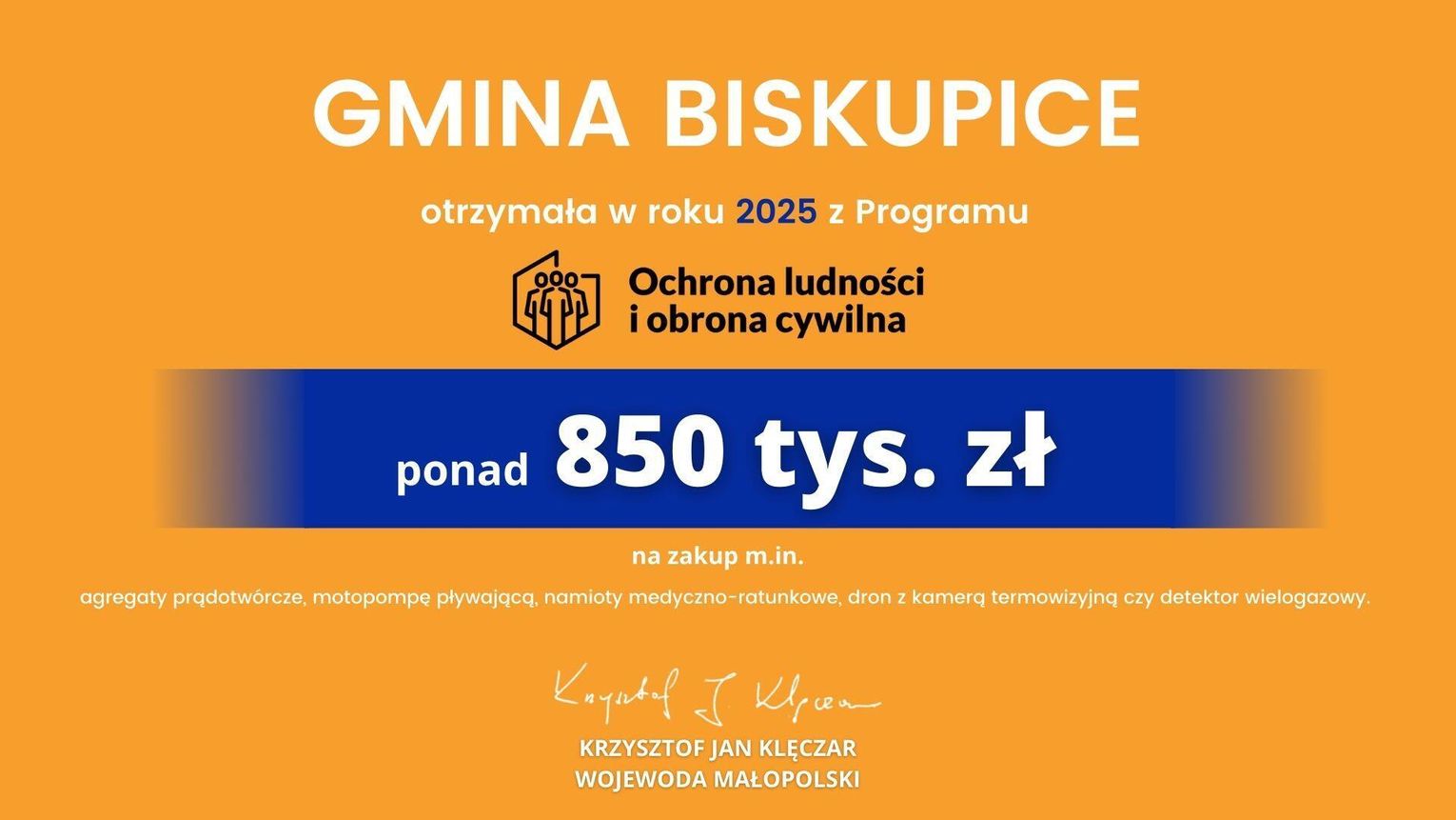 Dzięki dotacji gmina Biskupice w ramach Programu Ochrony Ludności i Obrony Cywilnej zakupiła m.in. agregaty prądotwórcze, motopompę pływającą, namioty medyczno-ratunkowe, dron z kamerą termowizyjną czy detektor wielogazowy.