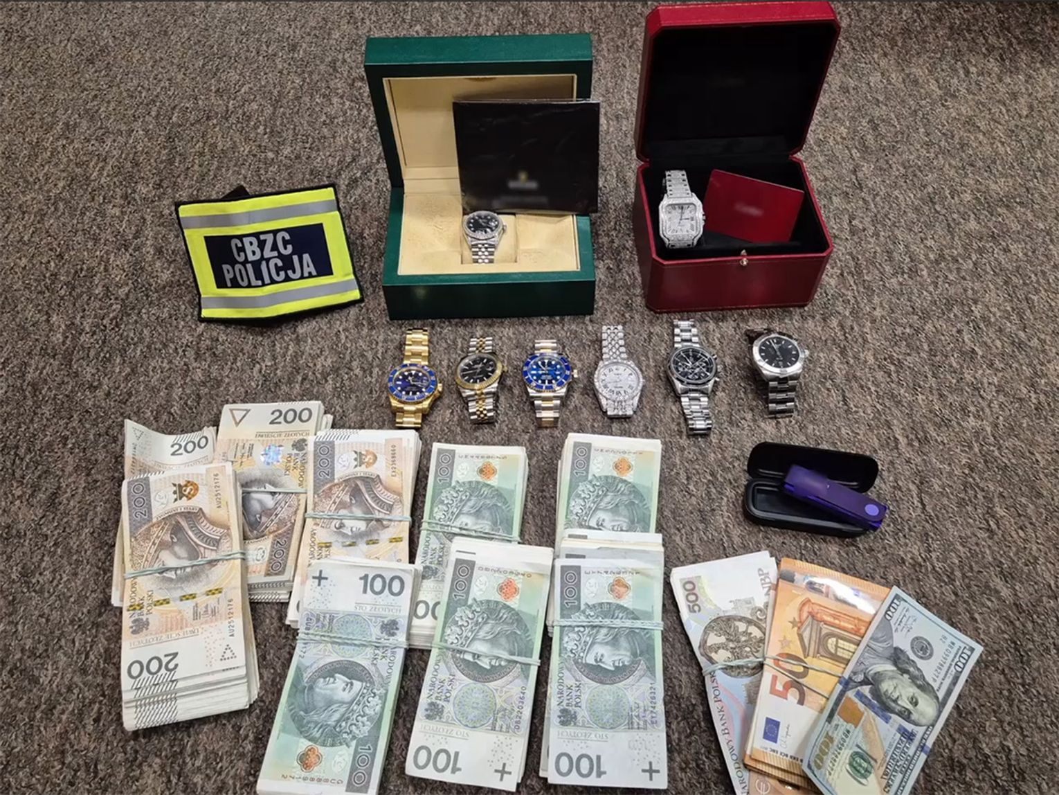 W toku prowadzonych czynności łącznie zabezpieczono mienie o wartości co najmniej 4 mln zł, w tym ponad 3 mln. zł zgromadzone w kryptowalutach oraz luksusowe zegarki znanych i renomowanych marek.